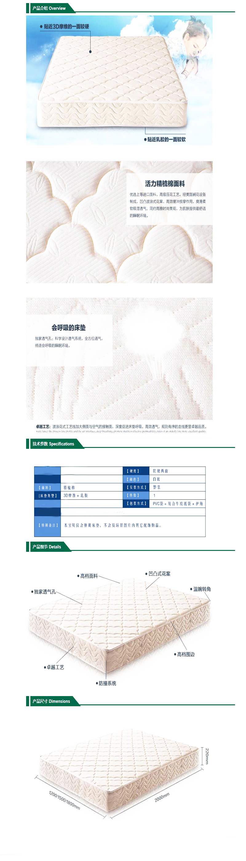 ·优选上等进口面料,高级压花工艺,经美国涧花设备制成,凹凸波浪式花案,高效缓冲按摩作用,爽滑柔软吸湿透气、简约高雅时尚美观,为肌肤提供最舒适的睡眠环境