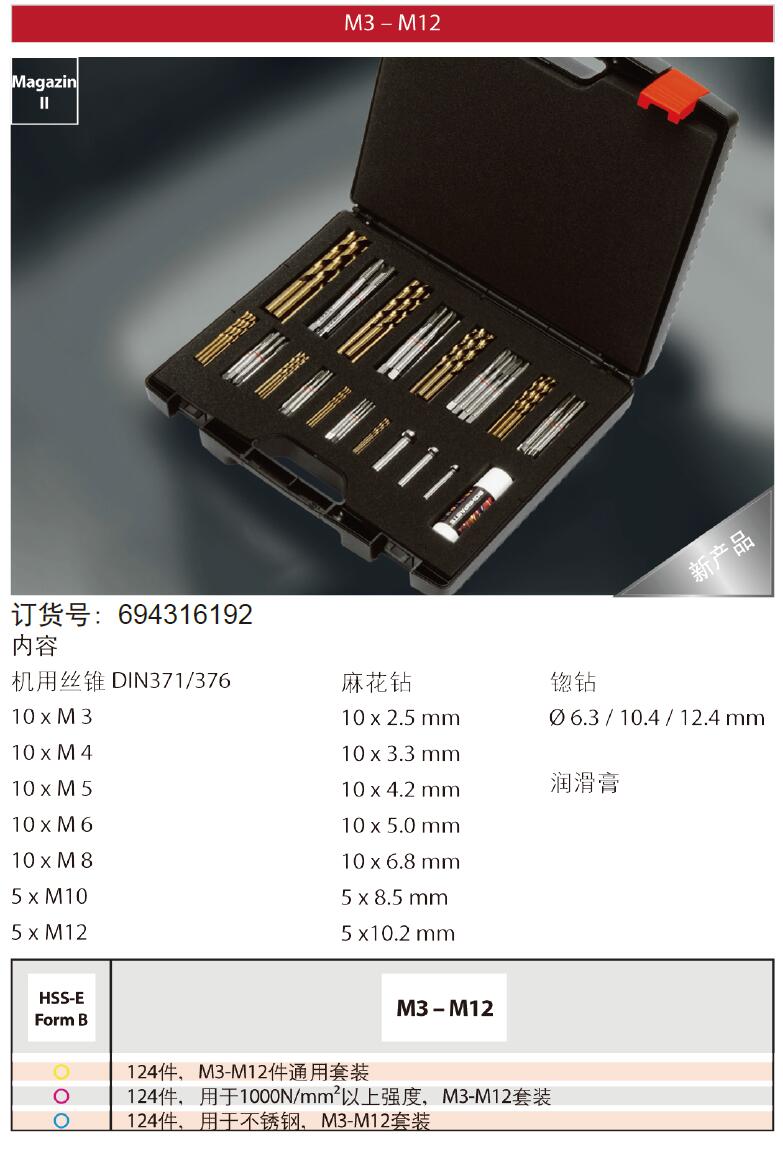 机用丝锥DIN371/376:10*M3/10*M4/10*M5/10*M6/10*M8/5*M10/5*M12 麻花钻:10*2.5mm/10*3.3mm/10*4.2mm/10*5.0mm/10*6.8mm/5*8.5mm/5*10.2mm 锪钻:Φ6.3/10.4/12.4mm 润滑膏