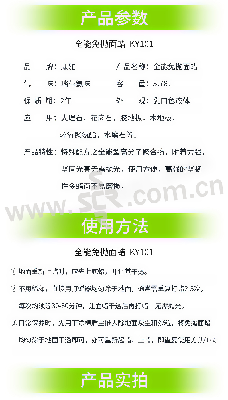 ·特殊配方之高分子聚合物,附着力强,坚固光亮无需抛光,使用方便,高强的坚韧性令蜡面不易磨损。
