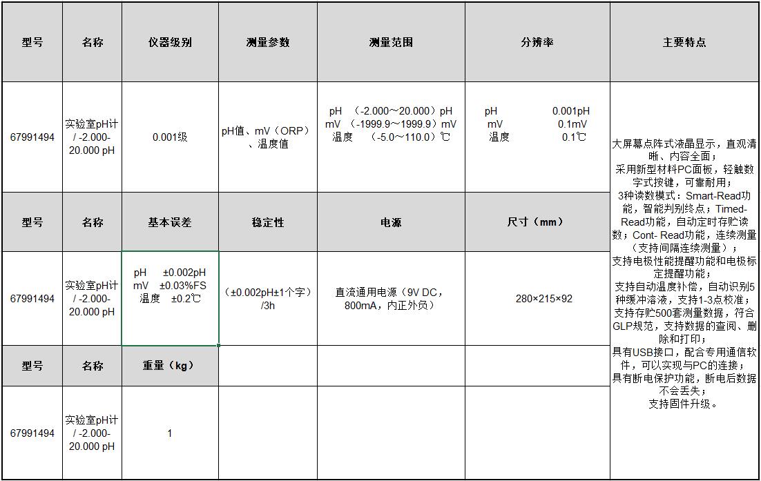 B17530 67991491 pH(-2.000~20.000)pH mV(-2000.00~2000.00)mV 温度(-5.0~130.0)℃ pH0.001pH mV0.01mV 温度0.1℃ 0.001级 pH值、mV(ORP)、温度值 pH±0.002pH mV±0.03%FS 温度±0.1℃ (±0.002pH±1个字)/3h 电源适配器(输入:100-240VAC,1.35A;输出:24VDC,3A) 280×280×130mm 2.5Kg 34552.88