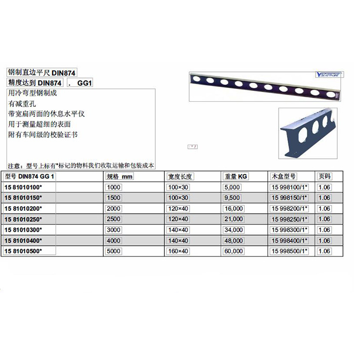 ·钢制直边平尺DIN874 ·精度达到DIN874 . GG1 ·用冷弯型钢制成有减重孔 ·带宽扁两面的休息水平仪用于测鼠超细的表面 ·附有车间级的校验证书