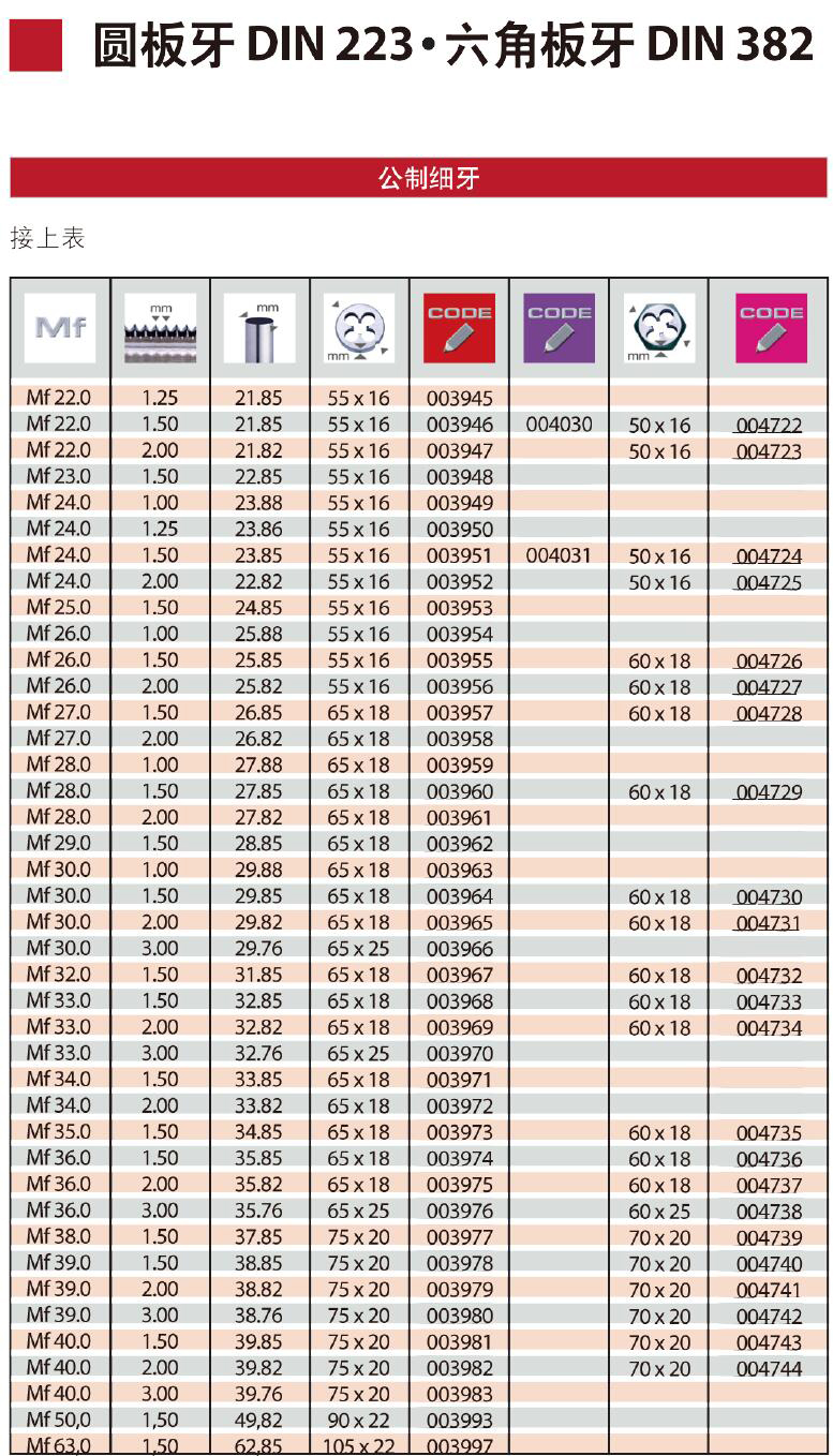 ·经久耐用,产品物美价廉 ·技术信息:HSS=高速钢 板牙DIN 223 B=22568 六角板牙DIN 382,用于ISO公制螺纹DIN13,公差6g