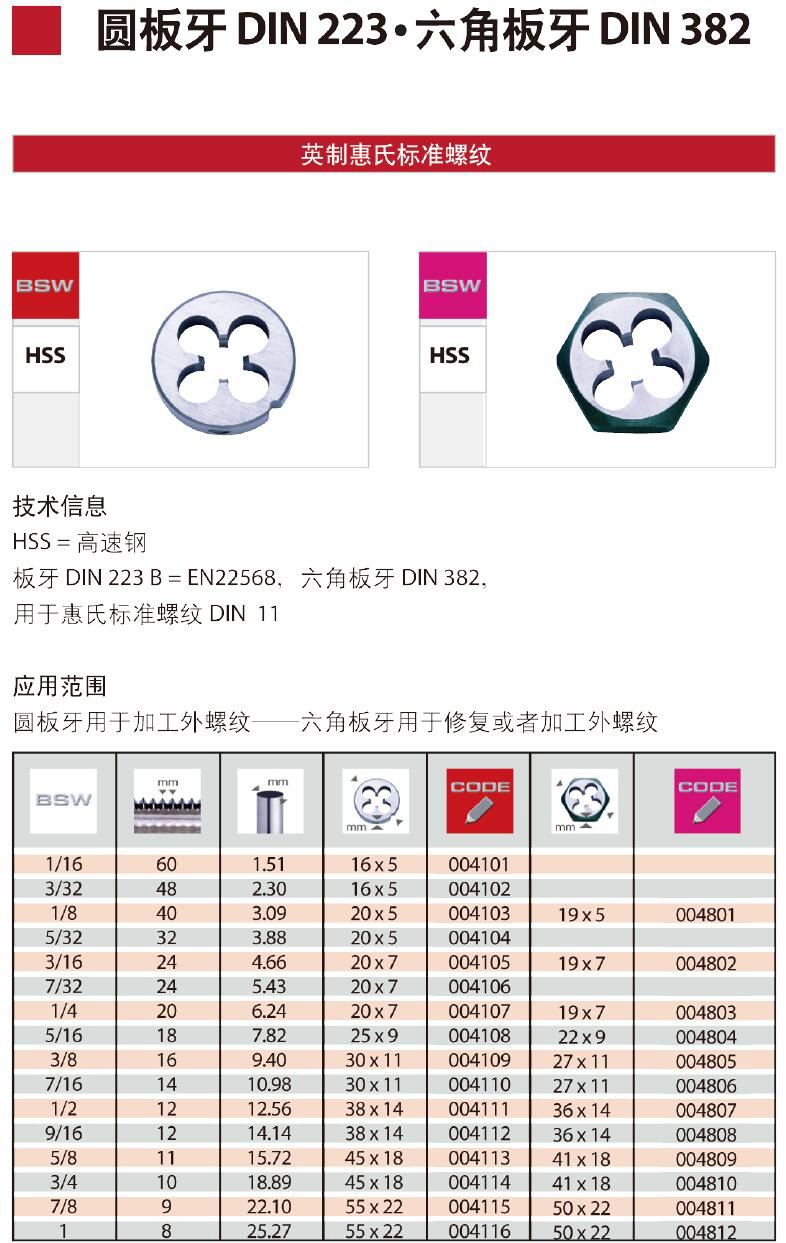 ·经久耐用,产品物美价廉 ·技术信息;HSS=高速钢 板牙DIN223=EN22568,六角板牙 DIN 382,用于惠氏标准螺纹 DIN 11