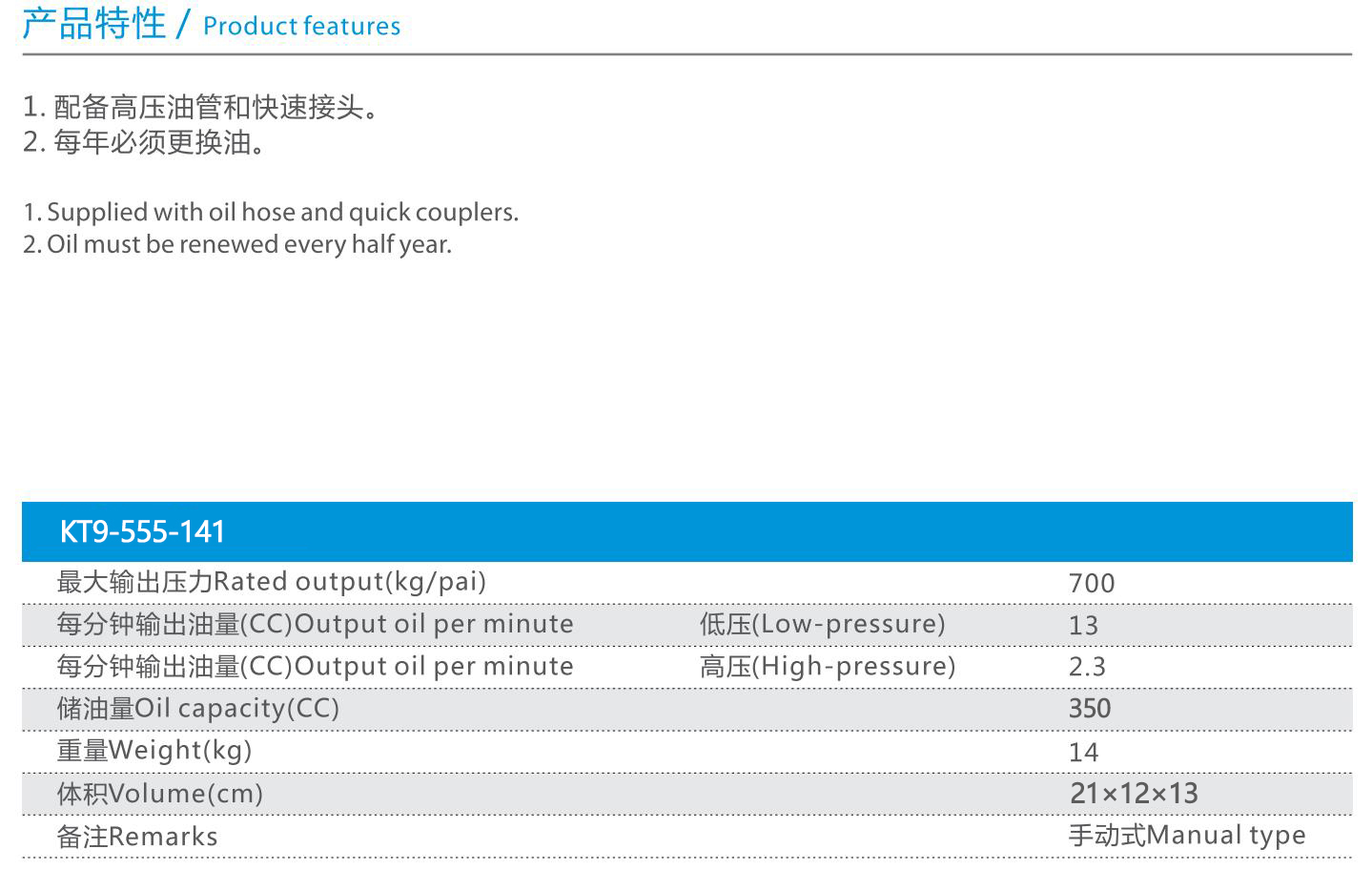 ·配备高压油管和快速接头。 ·每年必须更换油。