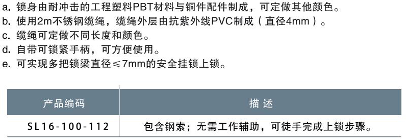 ·包含钢索;无需工作辅助,可徒手完成上锁步骤。