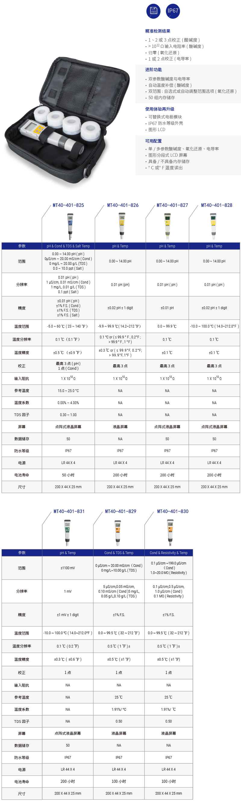 双参数酸碱度与电导率;自动温度补偿(酸碱度);双范围:自选式或自动调整范围选项(氧化还原);52组内存储存 |