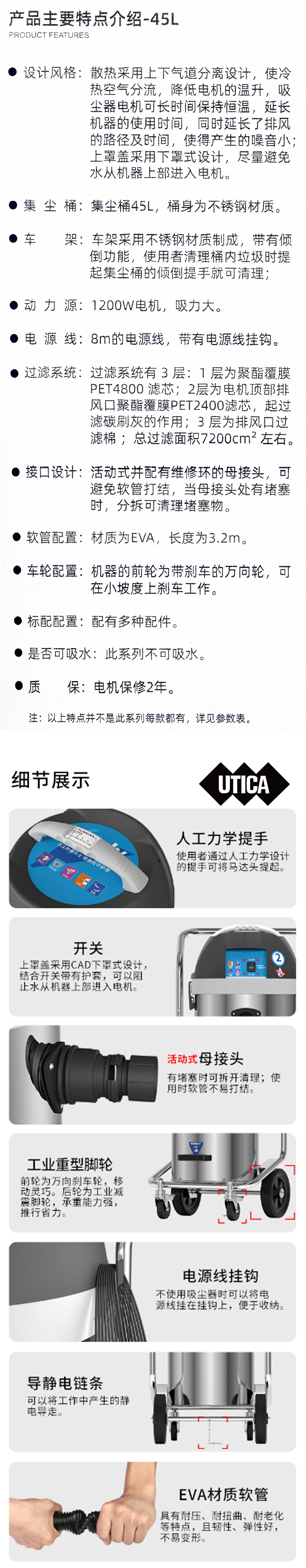 J16036 MT40-401-939 1200W 8M的电源线 集尘桶20/33L,桶身为PP材质注塑而成,桶内无螺丝,光滑易清理。 机器的前轮为万向轮,在移动时轻巧灵活方便 纸袋、布袋、可推车架(1233)配有多种配件 电源线8米+软管3.2米+调风手柄0.3米+金属伸缩管1.2米+吸尘刷0.2米约等于12.7米*2 7569.42