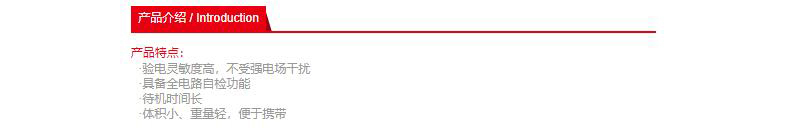 ·验电灵敏度高,不受强电场干扰 ·具备全电路自检功能 ·待机时间长 ·体积小、重量轻,便于携带