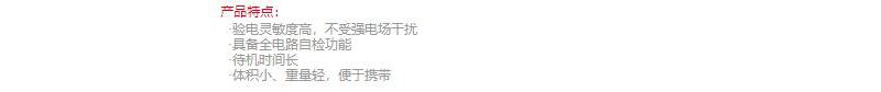 ·验电灵敏度高,不受强电场干扰 ·具备全电路自检功能 ·待机时间长 ·体积小、重量轻,便于携带
