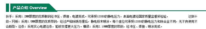 ·扶手:采用1.2MM厚度的优质鞍钢经冲压、焊接、电镀而成。可承受120KG的静电压力,表面电镀经国家质量监督所检验,GB6461-21002达到十级。网板:采用1.5MM厚度的优质带钢,经过严格除锈处理后,静电粉末喷涂。每个座位可承受120KG的·静电压力和锌合金不同,无不良使用不会断裂。边条:采用实心电镀边条,能够支撑更大压力。横梁:采用2.19MM厚度的带钢,经冲压、焊接、喷涂而成。