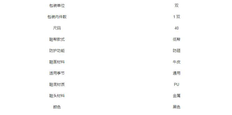 ·优质压花水牛皮鞋面,皮革厚度1.6~1.8mm ·聚氨酯(PU)注塑鞋底 ·优质BK布内里,透气 ·EVA鞋垫 ·非封闭鞋舌 ·舒适轻便、防砸、耐磨、耐油 ·符合国标 ·重量900g
