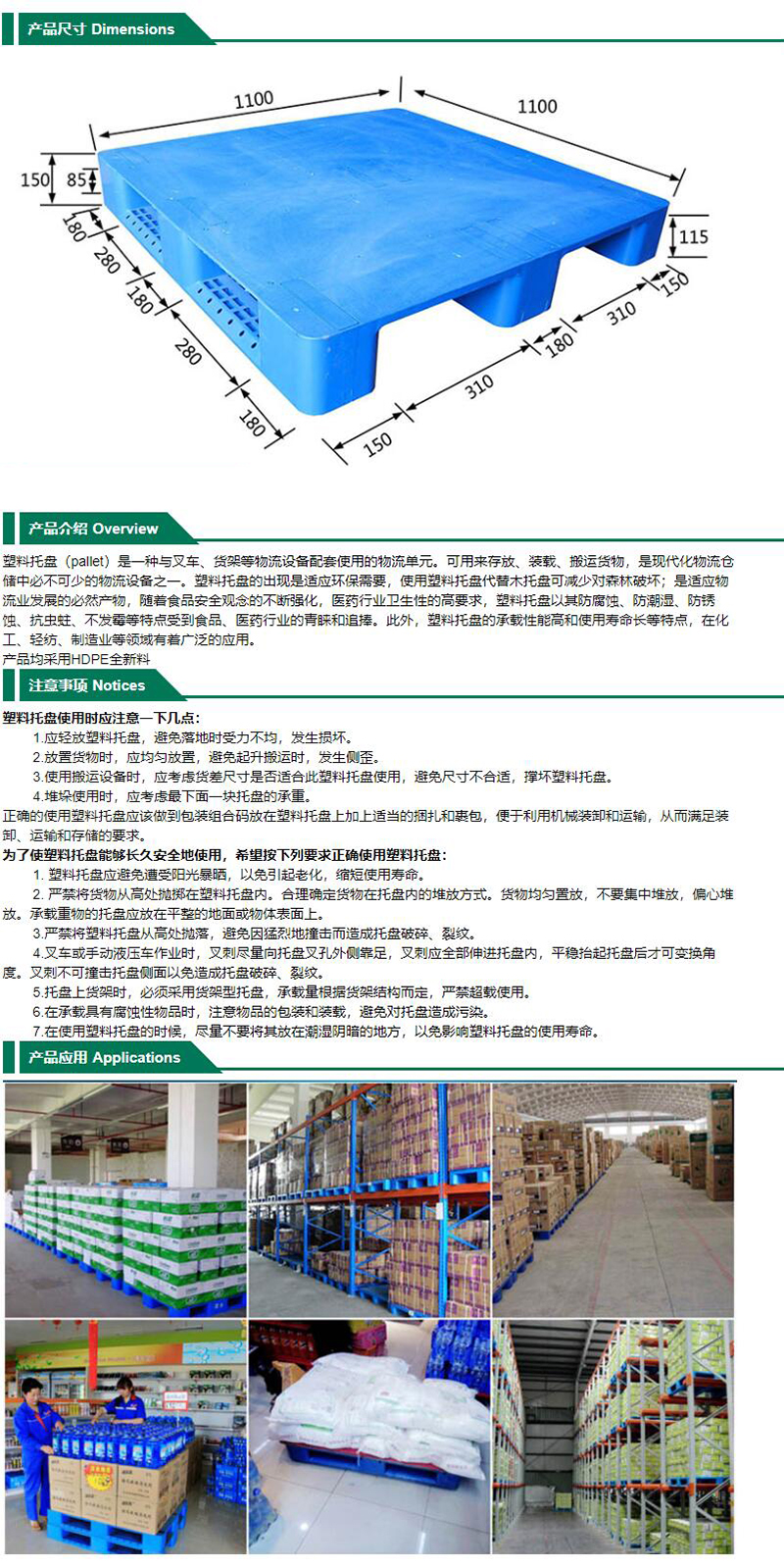 ·塑料托盘(pallet)是一种与叉车、货架等物流设备配套使用的物流单元。可用来存放、装载、搬运货物,是现代化物流仓储中必不可少的物流设备之一。塑料托盘的出现是适应环保需要,使用塑料托盘代替木托盘可减少对森林破坏;是适应物流业发展的必然产物,随着食品安全观念的不断强化,医药行业卫生性的高要求,塑料托盘以其防腐蚀、防潮湿、防锈蚀、抗虫蛀、不发霉等特点受到食品、医药行业的青睐和追捧。此外,塑料托盘的承载性能高和使用寿命长等特点,在化工、轻纺、制造业等领域有着广泛的应用。
