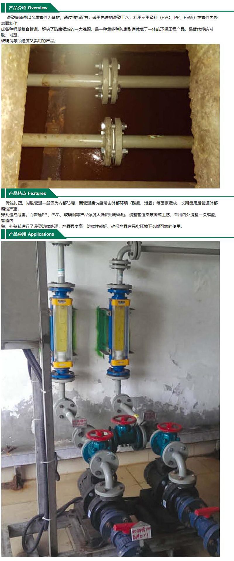 ·传统衬塑、衬胶管道一般仅为内部防腐,而管道腐蚀经常由外部环境(酸雾、泄露)等因素造成,长期使用后管道外部腐蚀严重,穿孔造成泄露,而普通PP、PVC、玻璃钢等产品强度太低使用寿命短。浸塑管道突破传统工艺,采用内外浸塑一次成型,管道内壁、外壁都进行了浸塑防腐处理,产品强度高、防腐性能好、确保产品在恶劣环境下长期可靠的使用。