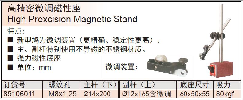 ·新型鸠为微调装置(更、稳定性更高)。 ·主、副杆特别使用不导磁的不锈钢材质。 ·强力磁性底座 ·单位:mm