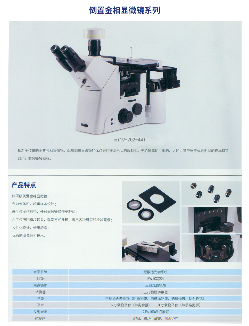 ·无限远色差校正光学系统;成像质量与进口产品相当;标准配置4个镜头,放大倍数:50X,100X,200X,500X,1000X可选配