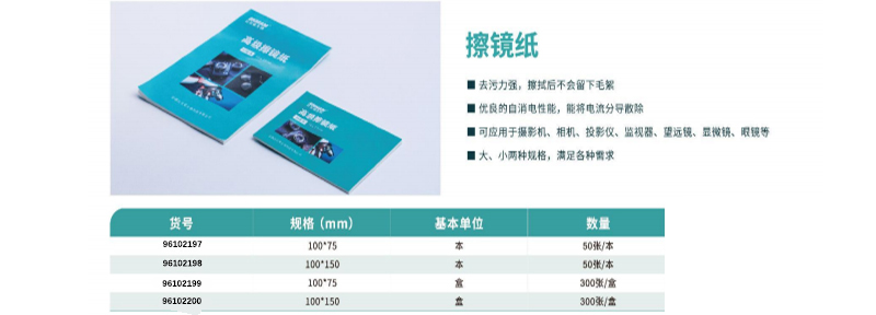 ·去污力强,擦拭后不会留下毛絮 ·优良的自消电性能,能将电流分导散除 ·可应用于摄影机、相机、投影仪、监视器、望远镜、显微镜、眼镜等 ·大、小两种规格,满足各种需求