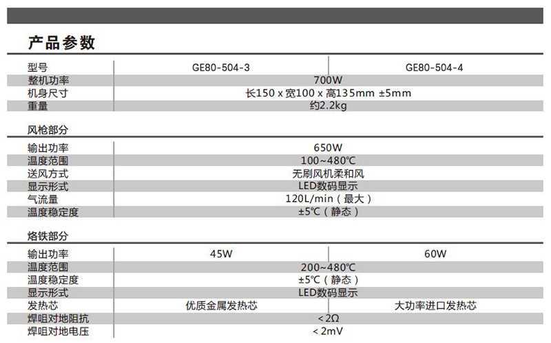 ·风枪、烙铁二合一,LED双数显,整机精致小巧,功能丰富,节省空间,运输成本低.。