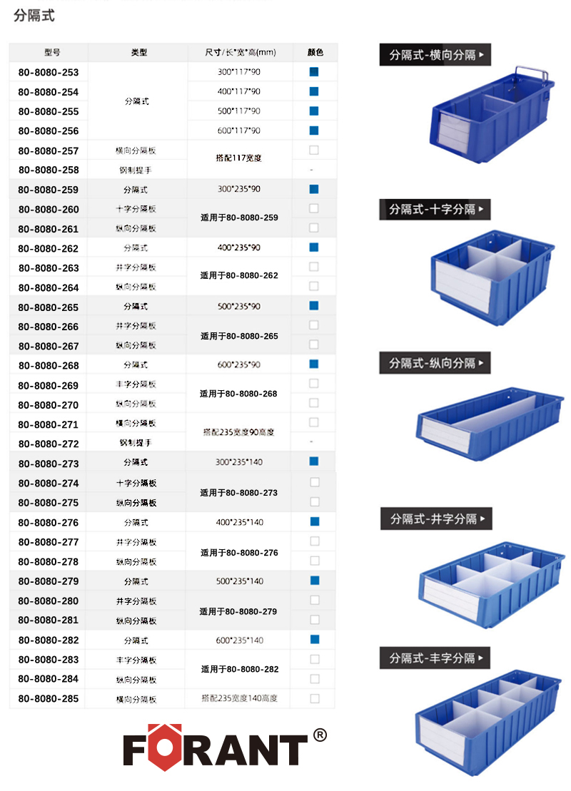 订货号 制造商型号 外形尺寸(长×宽×高) 最多可用横/纵分数隔片 颜色 内径尺寸(长×宽×高) 价格 购物车