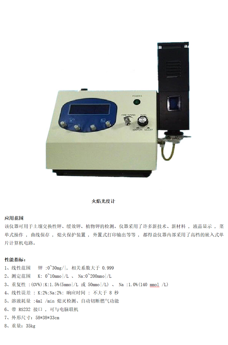 ·火焰光度计是以发射光谱为基本原理的一种分析仪器 ·包括气体和火焰燃烧部分,光学部分,光电转换器及检测记录部分 ·利用火焰的热能使某元素的原子激发发光,并用仪器检测其光谱能量的强弱,进而判断物质中某元素含量的高低 ·LCD液晶屏显示,直观清晰 ·一键自动点火 ·带有火焰大小预先选定功能 ·熄火检测与自动切断燃气功能