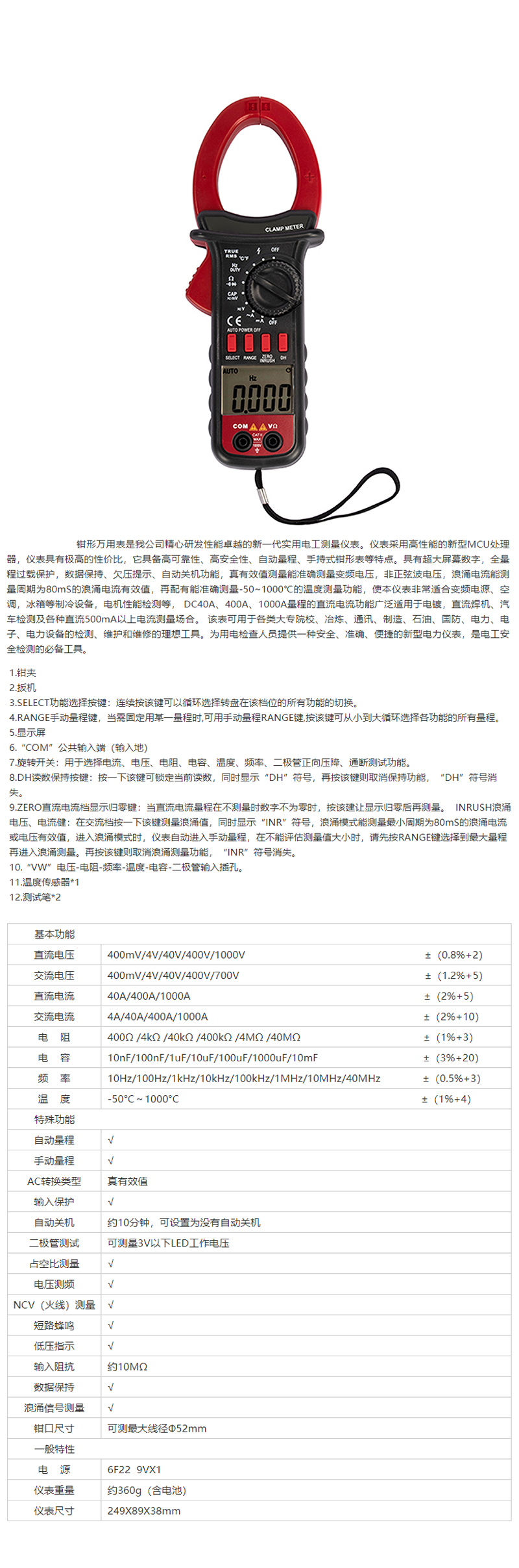 ·是一款性能稳定、安全、可靠的1999计数的数字钳型表,其独特的外观设计、严谨的结构设计,合理的功能配置使之成为一款性能优异的电工仪表.特别针对电工用户的设计,尤其适合设备的日常巡检和维护。UT200A(交流电流2A)的特点使得产品可以用于小型家用电器设备(低功率)的测量