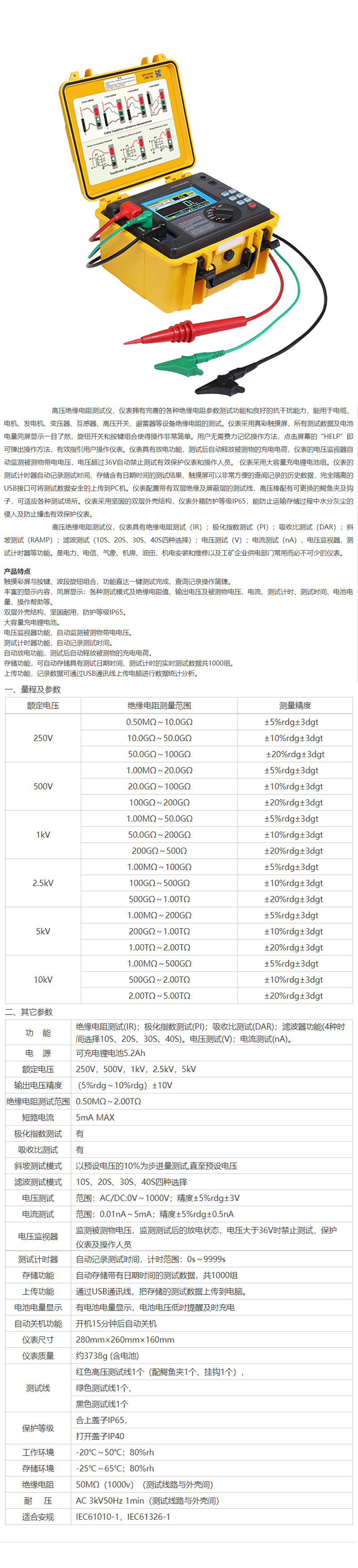 ·多种测量模式:单点快速测量、定时测量、吸收比测量、极化指数测量、步进电压测量。 ·自动放电及显示放电电压。 ·开放式原始通讯协议,便于用户二次开发使用。