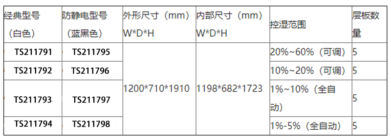 规格:  防静电型容积1436L(四门)控制范围(RH)1%~10%(全自动) 制造商型号:  TS211797
