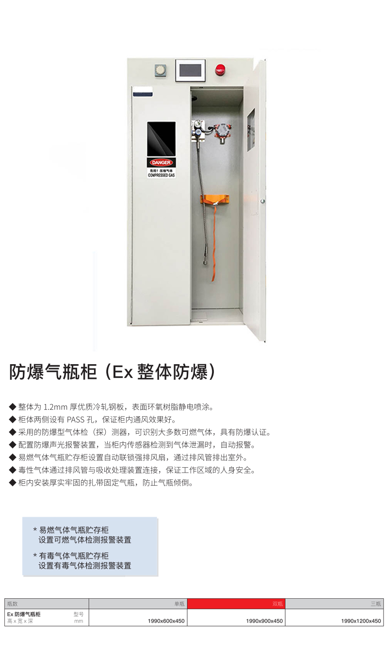 ·此款气瓶柜不带报警功能; ·全钢气瓶柜,可储存氮气、氧气、多种惰性气体; ·柜体采用加厚优质冷轧钢板,酸洗磷化处理; ·表面通过环氧树脂静电喷涂,达到防酸碱及防锈的效果;