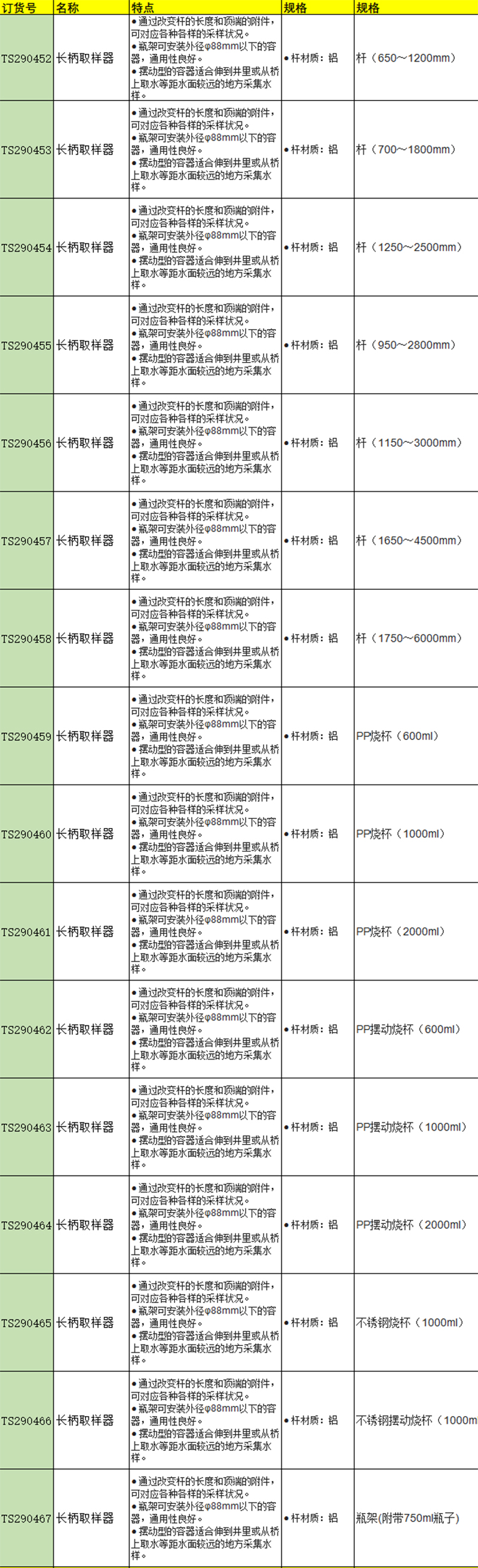 · 通过改变杆的长度和顶端的附件,可对应各种各样的采样状况。 · 瓶架可安装外径φ88mm以下的容器,通用性良好。 · 摆动型的容器适合伸到井里或从桥上取水等距水面较远的地方采集水样。