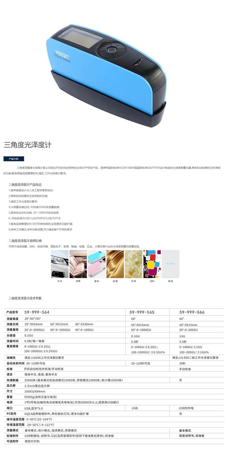 B80809 59-999-564 20°:0~2000GU,60°:0~1000GU,85°:0~160GU 光学 ·0~ 100GU:±0.2GU;100~2000GU:±0.2%GU 测量角度 20° 60° 85° 0.1GU 7590.00