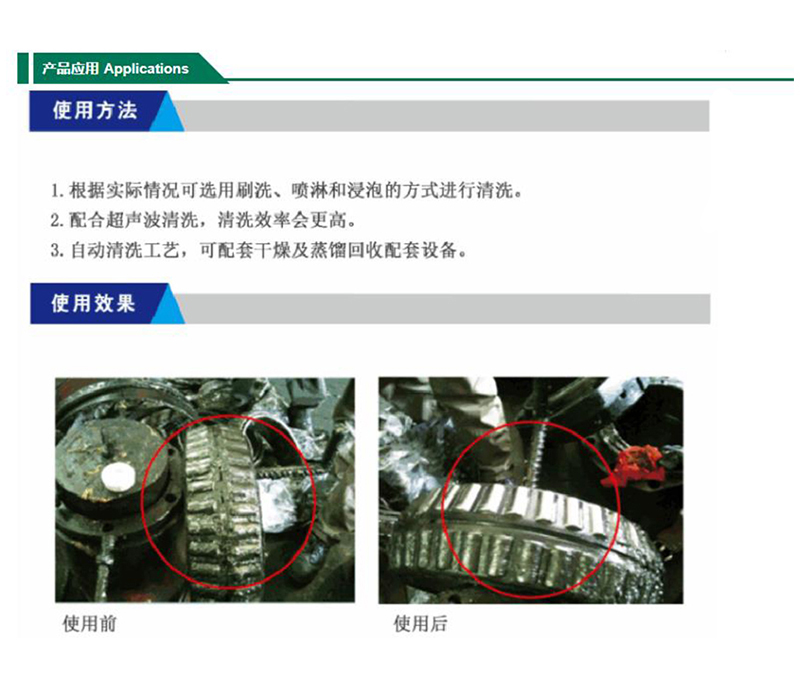 ·产品专业性:常用于机械加工部件、精密金属等除油脱脂。 ·环保:可替代柴、煤油对油脂、油污的清洗,节能减排,有利于环保。去污能力强:可快速清洗金属表面的油脂和污垢,可降低企业使用成本。高闪点、气味低:使用更安全,能给清洗职工带来良好的工作环境。