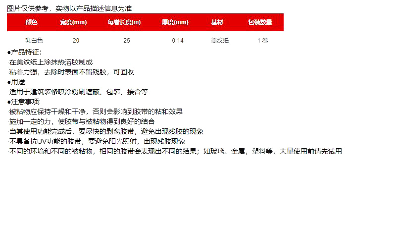·在美纹纸上涂抹热溶胶制成 ·粘着力强,去除时表面不留残胶,可回收