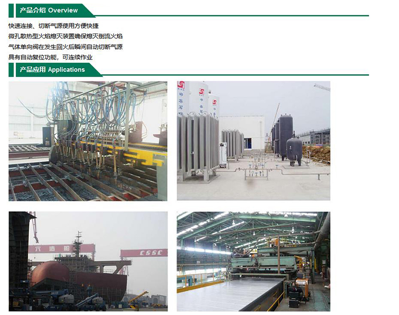 ·快速连接、切断气源使用方便快捷 ·微孔散热型火焰熄灭装置确保熄灭倒流火焰 ·气体单向阀在发生回火后瞬间自动切断气源 ·具有自动复位功能,可连续作业