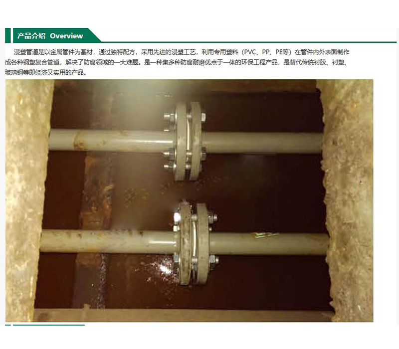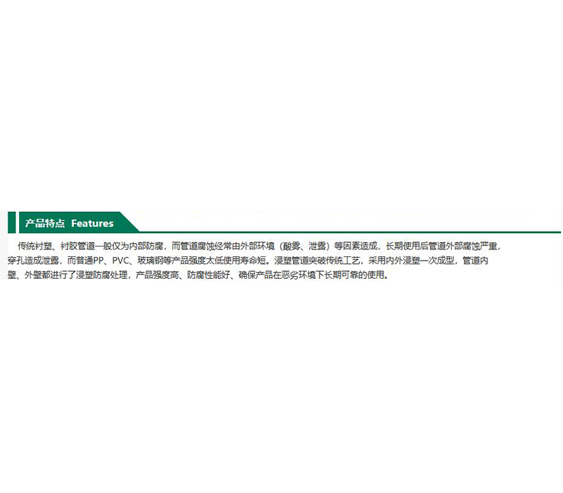 ·传统衬塑、衬胶管道一般仅为内部防腐,而管道腐蚀经常由外部环境(酸雾、泄露)等因素造成,长期使用后管道外部腐蚀严重,穿孔造成泄露,而普通PP、PVC、玻璃钢等产品强度太低使用寿命短。浸塑管道突破传统工艺,采用内外浸塑一次成型,管道内壁、外壁都进行了浸塑防腐处理,产品强度高、防腐性能好、确保产品在恶劣环境下长期可靠的使用。