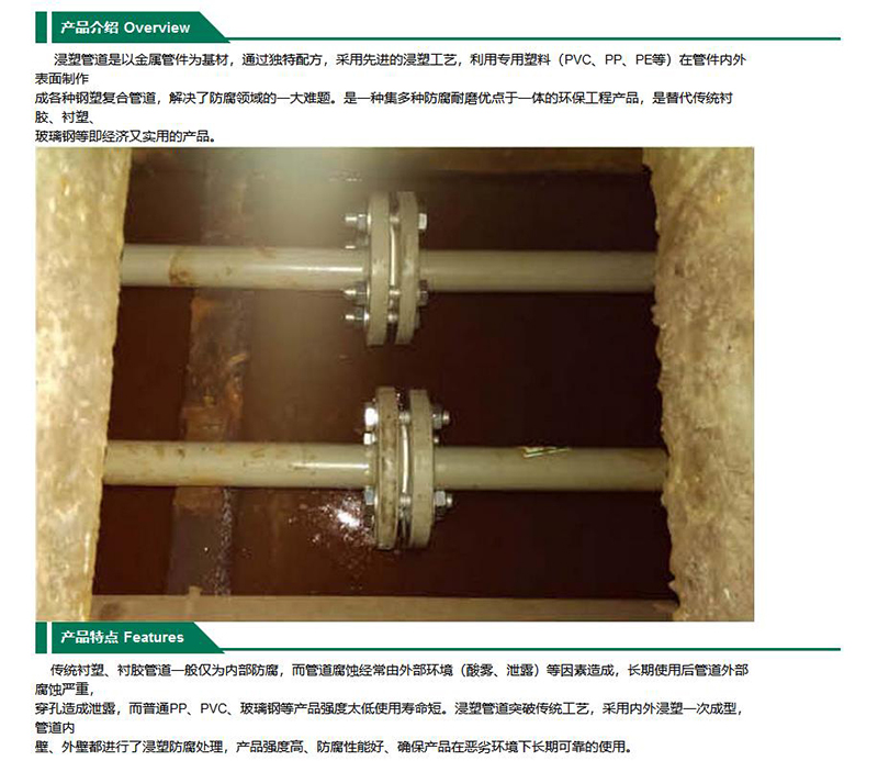 ·传统衬塑、衬胶管道一般仅为内部防腐,而管道腐蚀经常由外部环境(酸雾、泄露)等因素造成,长期使用后管道外部腐蚀严重, 穿孔造成泄露,而普通PP、PVC、玻璃钢等产品强度太低使用寿命短,浸塑管道突破传统工艺,采用内外浸塑一次成型,管道内壁、外壁都进行了浸塑防腐处理,产品强度高、防腐性能好、确保产品在恶劣环境下长期可靠的使用