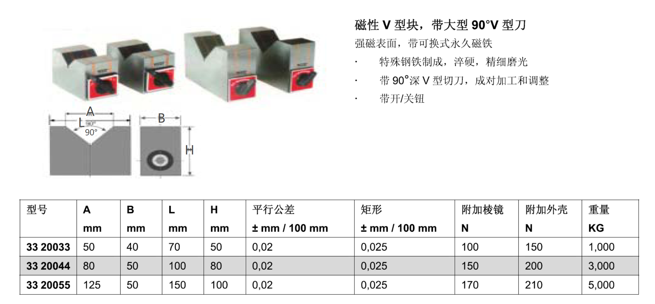 ·磁性V型块, 带大型90°V型刀强磁表面, 带可换式永久磁铁特殊钢铁制成,¥卒硬, 精细磨光 带90°深V型切刀, 成对加工和调整 带开/关钮