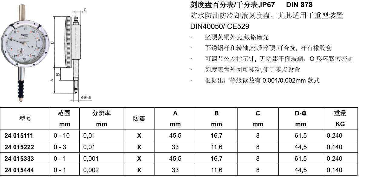·坚硬黄铜外壳·镀铬磨光 ·不锈钢杆和转轴·材质淬硬·可合拢·杆有橡胶套 ·可调节公差指示针·无阴影平面玻璃·O形环紧密密封 ·刻度表盘外圈可移动·便于零点设置 ·根据出厂等级读数有0·001/0·002mm款式
