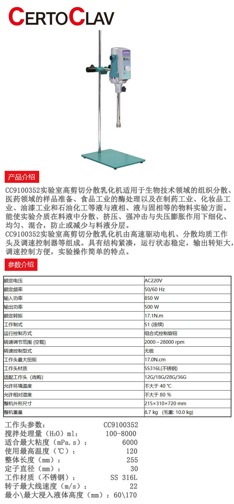 ·采用结构紧凑的串激式微型高速电机驱动,适用于实验室低至中、高粘度液体的搅拌混合;在液体介质中分散均质颗粒物料、组织细胞破碎等。