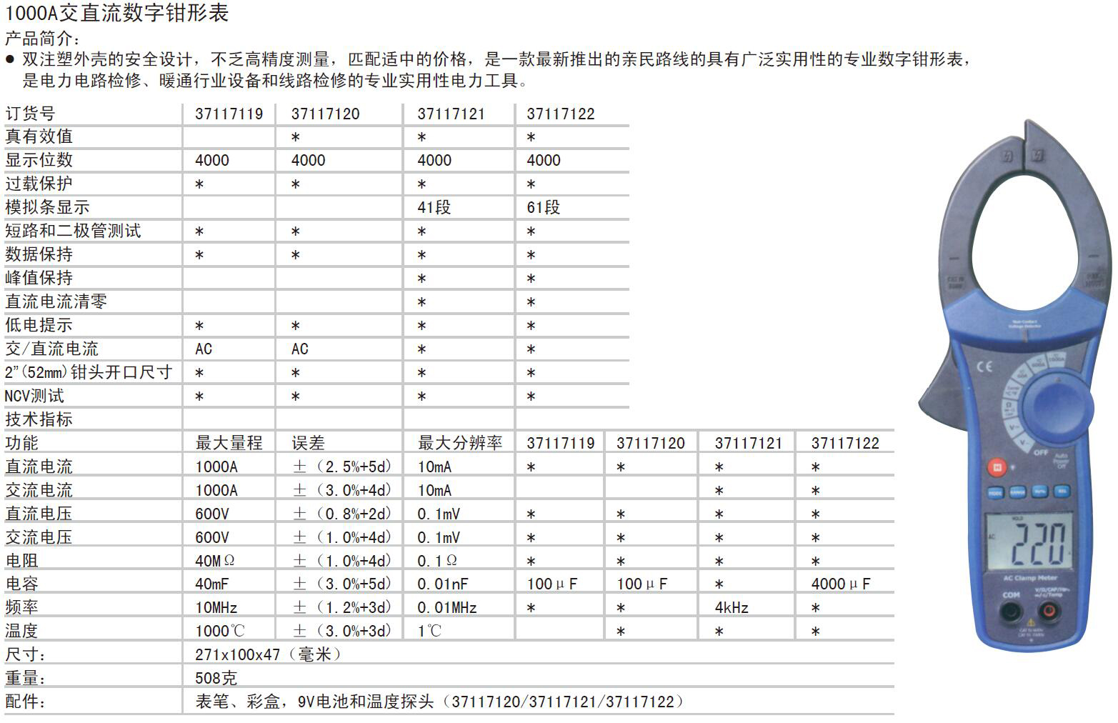 ·产品简介: · 双注塑外壳的安全设计,不乏高精度测量,匹配适中的价格,是一款最新推出的亲民路线的具有广泛实用性的专业数字钳形表,是电力电路检修、暖通行业设备和线路检修的专业实用性电力工具。 ·配件:表笔、彩盒,9V电池和温度探头