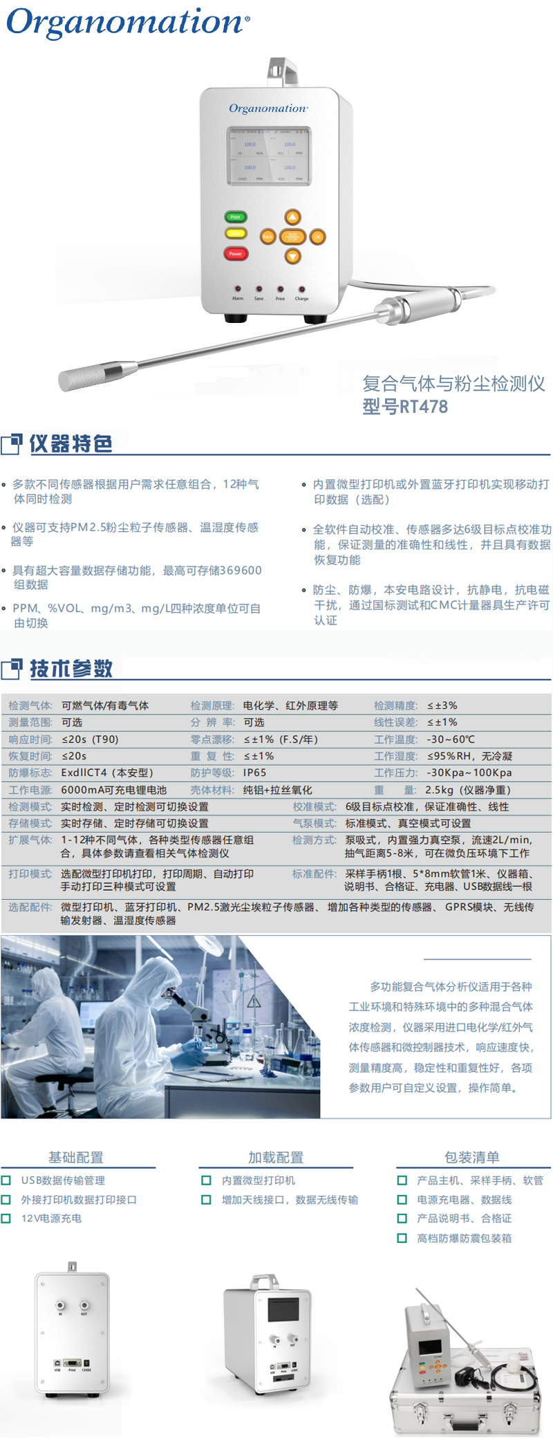 ·多款不同传感器根据用户需求任意组合,12种气 体同时检测 ·仪器可支持PM2.5粉尘粒子传感器、温湿度传感 器等 ·具有超大容量数据存储功能,最高可存储369600 组数据 ·PPM、%VOL、mg/m3、mg/L四种浓度单位可自由切换 ·内置微型打印机或外置蓝牙打印机实现移动打 印数据(选配) ·全软件自动校准、传感器多达6级目标点校准功 能,保证测量的准确性和线性,并且具有数据 恢复功能 ·防尘、防爆,本安电路设计,抗静电,抗电磁 干扰,通过国标测试和CMC计量器具生产许可认证