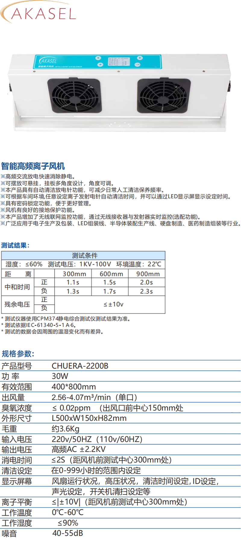 ·快速消除静电; ·体积小、重量轻,便携式设计,角度可调; ·本产品具有自动清洁放电针功能,可减少日常人工清洁保养频率; ·本产品增加了无线联网监控功能,通过无线接收器与发射器实时监控(选配功能); ·可根据车间环境,任意设定离子发射电针自动清洁时间,并可以通过LED显示屏显示设定时间; ·具有整机锁定功能(参照按键功能说明) ; ·风机有良好的接地保护功能。