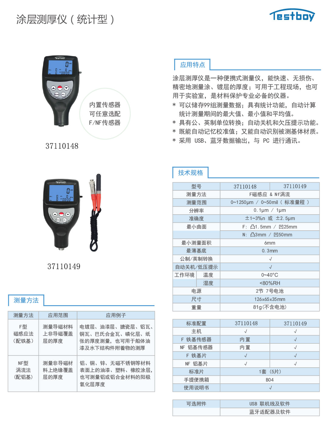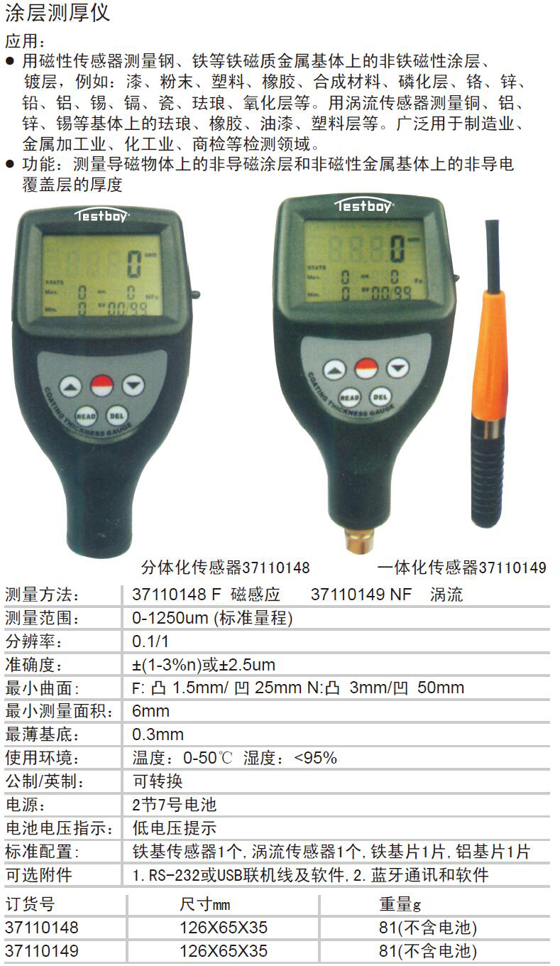 ·用磁性传感器测量钢、铁等铁磁质金属基体上的非铁磁性涂层、镀层,例如:漆、粉末、塑料、橡胶、合成材料、磷化层、铬、锌、铅、铝、锡、镉、瓷、珐琅、氧化层等。用涡流传感器测量铜、铝、锌、锡等基体上的珐琅、橡胶、油漆、塑料层等。广泛用于制造业、金属加工业、化工业、商检等检测领域。 ·功能:测量导磁物体上的非导磁涂层和非磁性金属基体上的非导电 覆盖层的厚度