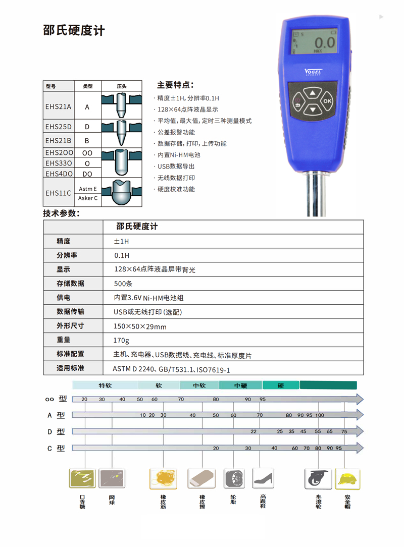 ·精度±lH, 分辨率0.lH·128*64点阵液晶显示·平均值,最大值,定时三种测星模式·公差报警功能·数据存储,打印,上传功能·内置Ni-HM电池·USB数据导出·无线数据打印·硬度校准功能