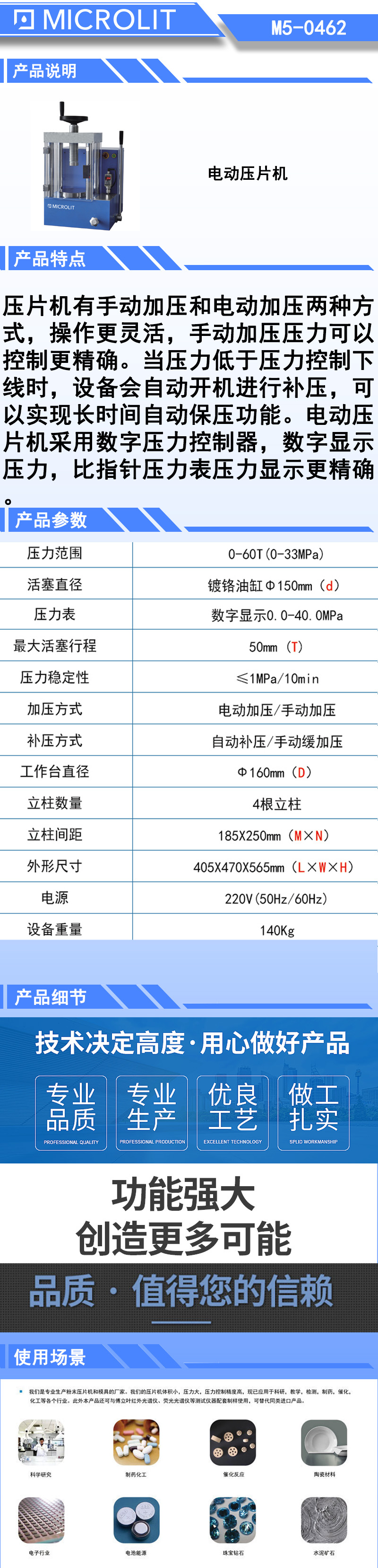*压片机有手动加压和电动加压两种方式,操作更灵活,手动加压压力可以控制更精确。 *当压力低于压力控制下线时,设备会自动开机进行补压,可以实现长时间自动保压功能。 *电动压片机采用数字压力控制器,数字显示压力比指针压力显示更精确。