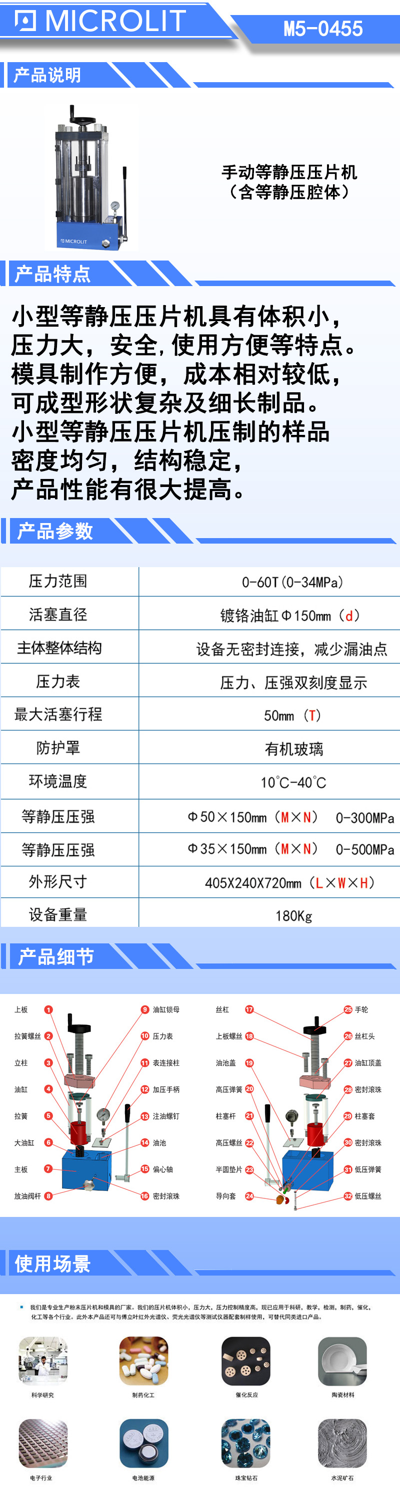 *小型等静压压片机具有体积小,压力大,安全,使用方便等特点。 *模具制作方便,成本相对较低,可成型形状复杂及细长制品。 *小型等静压压片机压制的样品密度均匀,结构稳定,产品性能有很大提高。