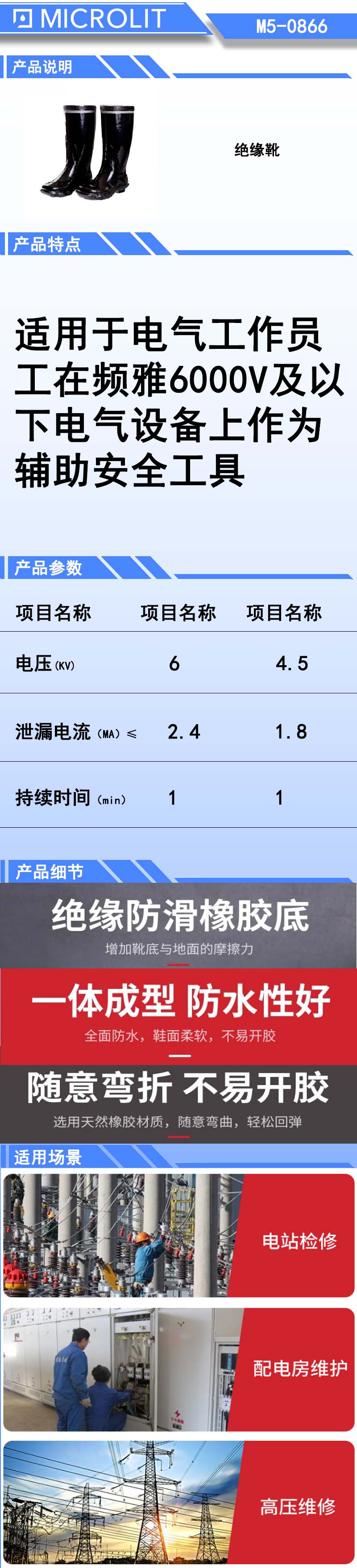 * 耐磨舒适 、安全绝缘、防水防滑 * 进口橡胶材质,安全绝缘,进口橡胶,柔软轻便抗拉,耐磨不易变形。 * 采用棉布内里更加牢固耐穿,吸汗清爽减少与外层绝缘的摩擦提高舒适度 * 防滑大底鞋型流畅穿戴舒适,安全可靠,新工艺加工增大鞋底与地面摩擦耐磨防滑