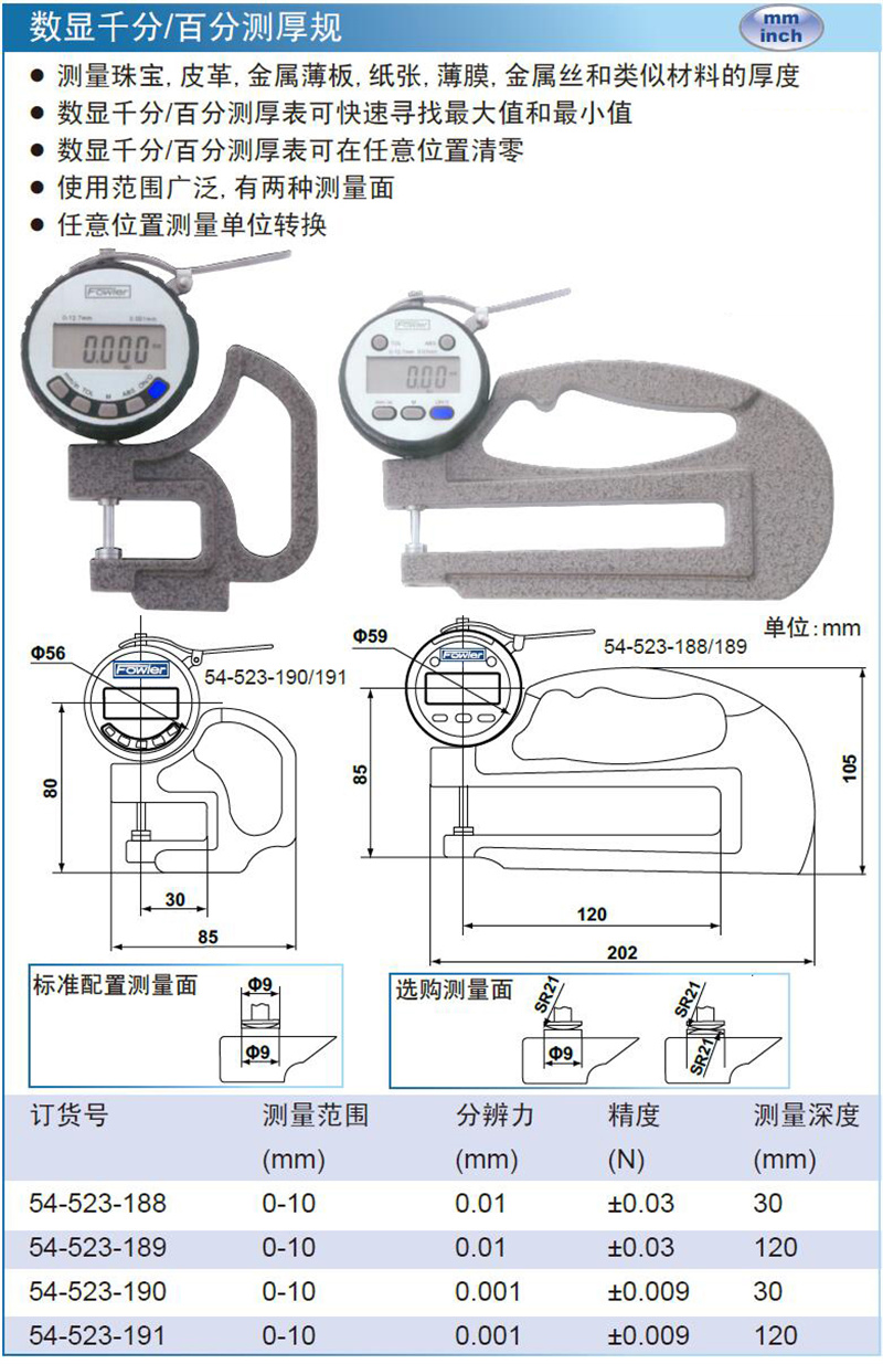 ·测量珠宝,皮革,金属薄板,纸张,薄膜,金属丝和类似材料的厚度 ·数显千分/百分测厚表可快速寻找最大值和最小值 ·数显千分/百分测厚表可在任意位置清零 ·使用范围广泛,有两种测量面 ·任意位置测量单位转换