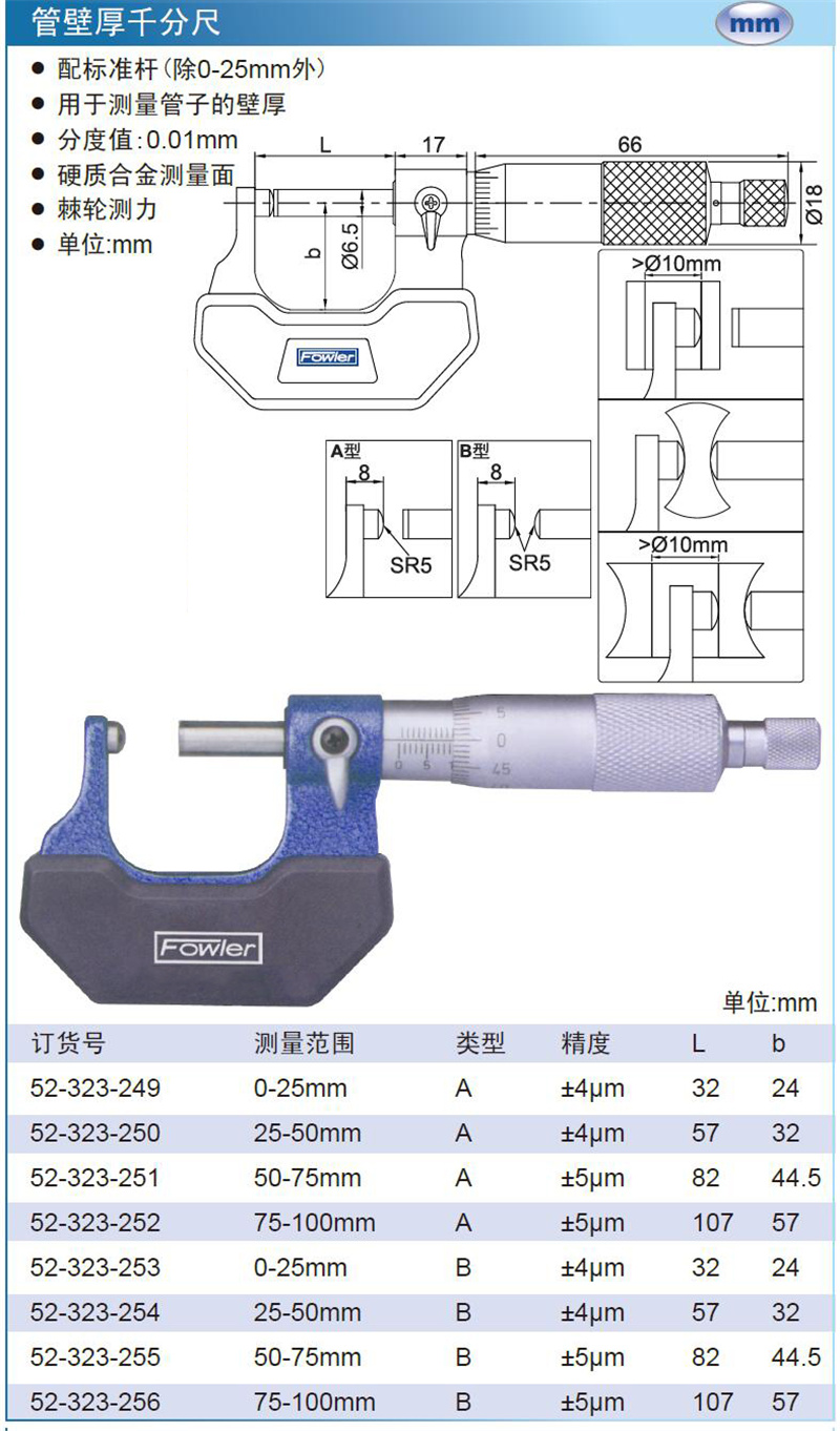 ·配标准杆(除0-25mm外) ·用于测量管子的壁厚 ·分度值:0.01mm ·硬质合金测量面 ·棘轮测力 ·单位:mm