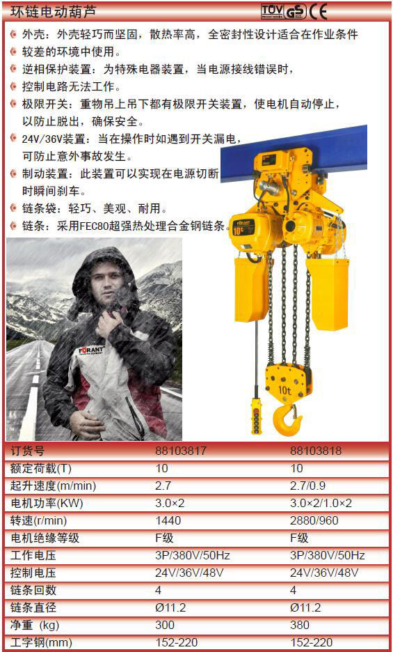 ·极限开关:重物吊上吊下都有极限开关装置,使电机自动停止,以防止脱出,确保安全。24V/36V装置:当在操作时如遇到开关漏电,可防止意外事故发生。