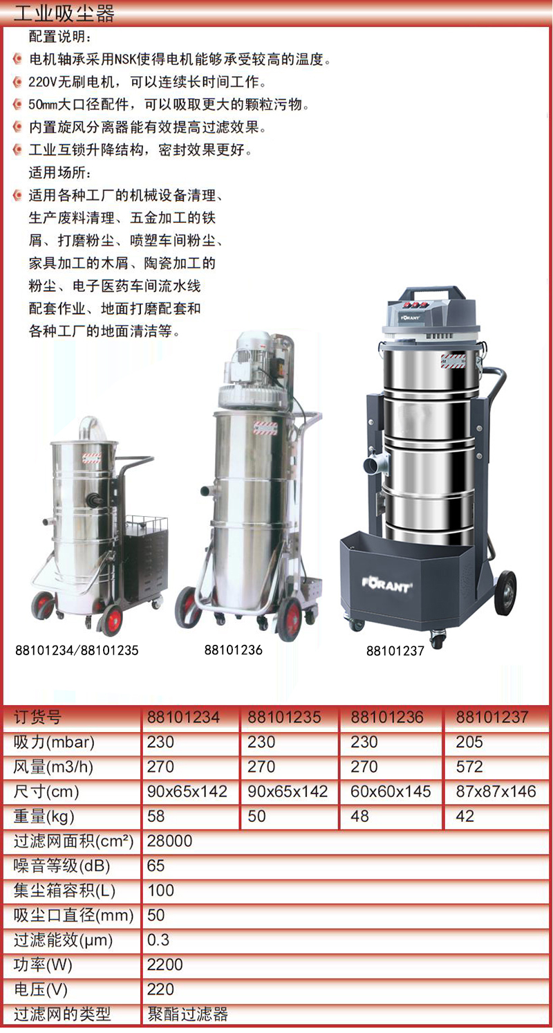 A27176 88101234 220V 2200.00w 230.00mba 270.00m3/h 90×65×142 58.00kg 28000cm² 65.00dB 100L 50mm 0.3μm 27060.00