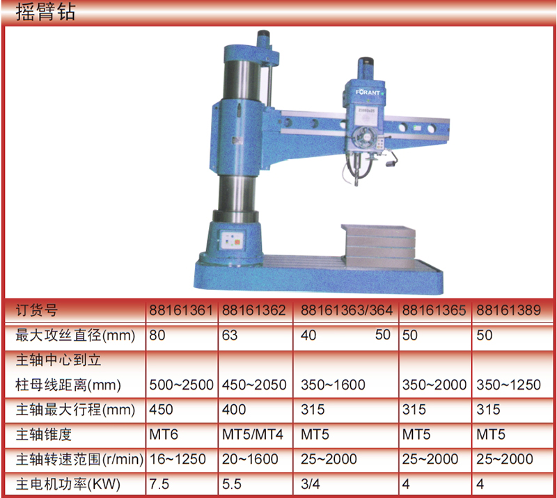 订货号 制造商型号 最大钻孔直径 主轴中心到立柱母线距离 主轴最大行程 主轴锥度 主轴转速范围 主电动机功率 毛重/净重 最大攻丝直径 价格 购物车